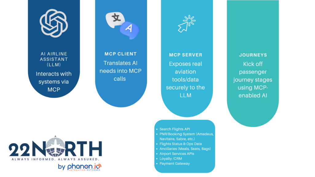 AI assistants could be of many kinds – a passenger chatbot, a travel agent assistant or a regular operations bot but with MCP, they can communicate with different aviation systems in a standardized manner. MCP servers (acting as backend plugins or tools, are exposed by every aviation backend system.